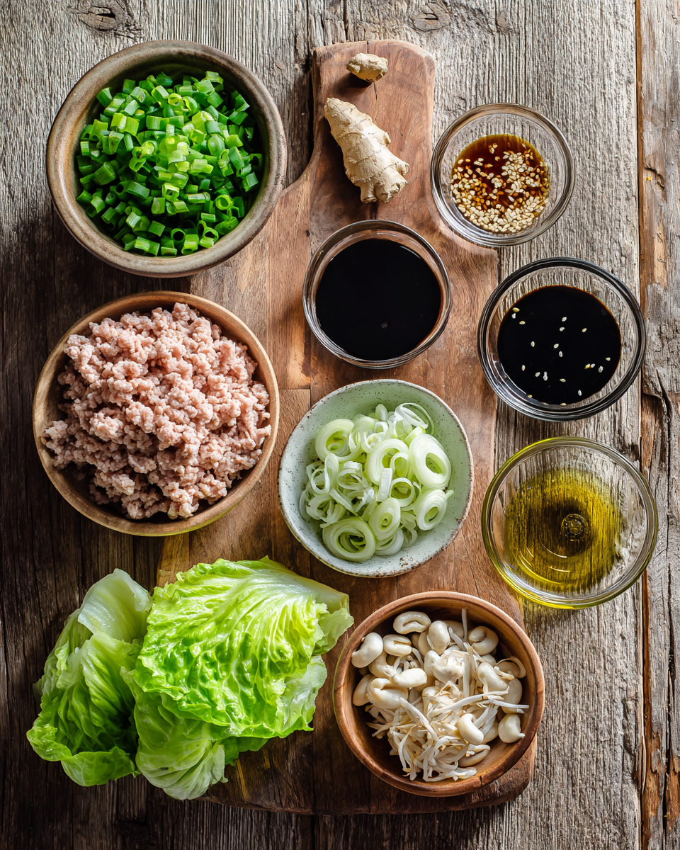 Here’s everything you’ll need to make these crave-worthy lettuce wraps. I like to group my ingredients so I can grab them quickly while cooking – no frantic fridge searches mid-recipe!