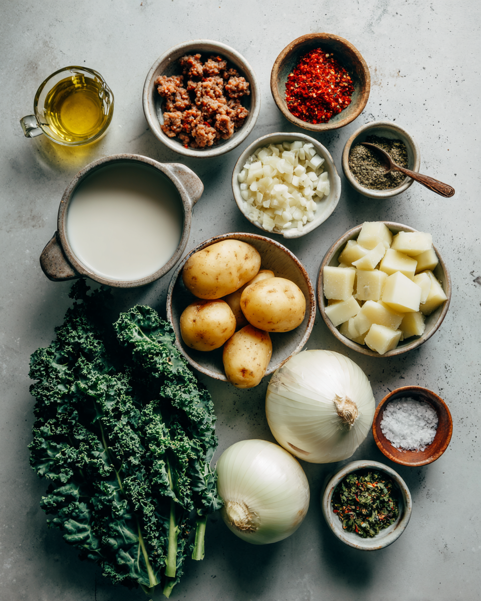 Gathering the right ingredients is half the battle when making this cozy vegan Zuppa Toscana. Here’s what you’ll need to create that perfect balance of creamy, hearty, and slightly spicy goodness: